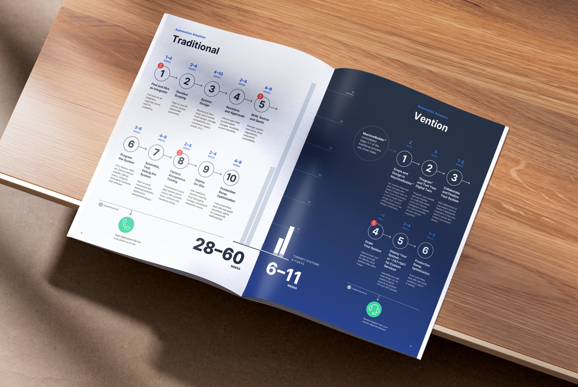 Der Fokus lag auf Struktur, Leseführung und Klarheit. Zahlen, Diagramme und ROI-Berechnungen sollten schnell erfassbar sein – technisch präzise, aber gut lesbar. Entstanden ist ein modulares Layoutsystem, das sich nahtlos ins bestehende Corporate Design einfügt und Vention eine konsistente, skalierbare Grundlage für zukünftige Whitepaper und Broschüren bietet.